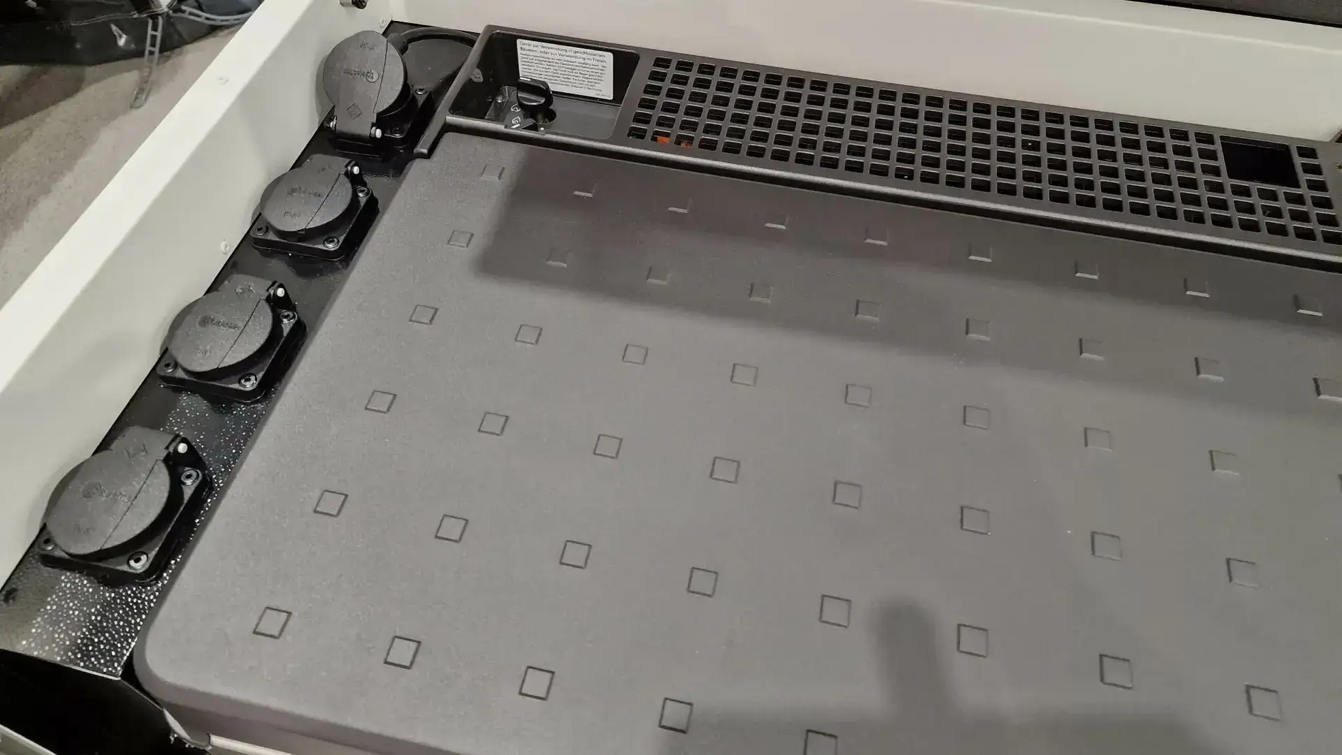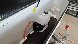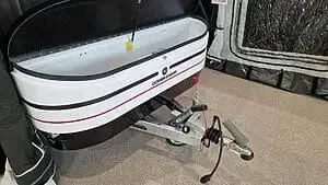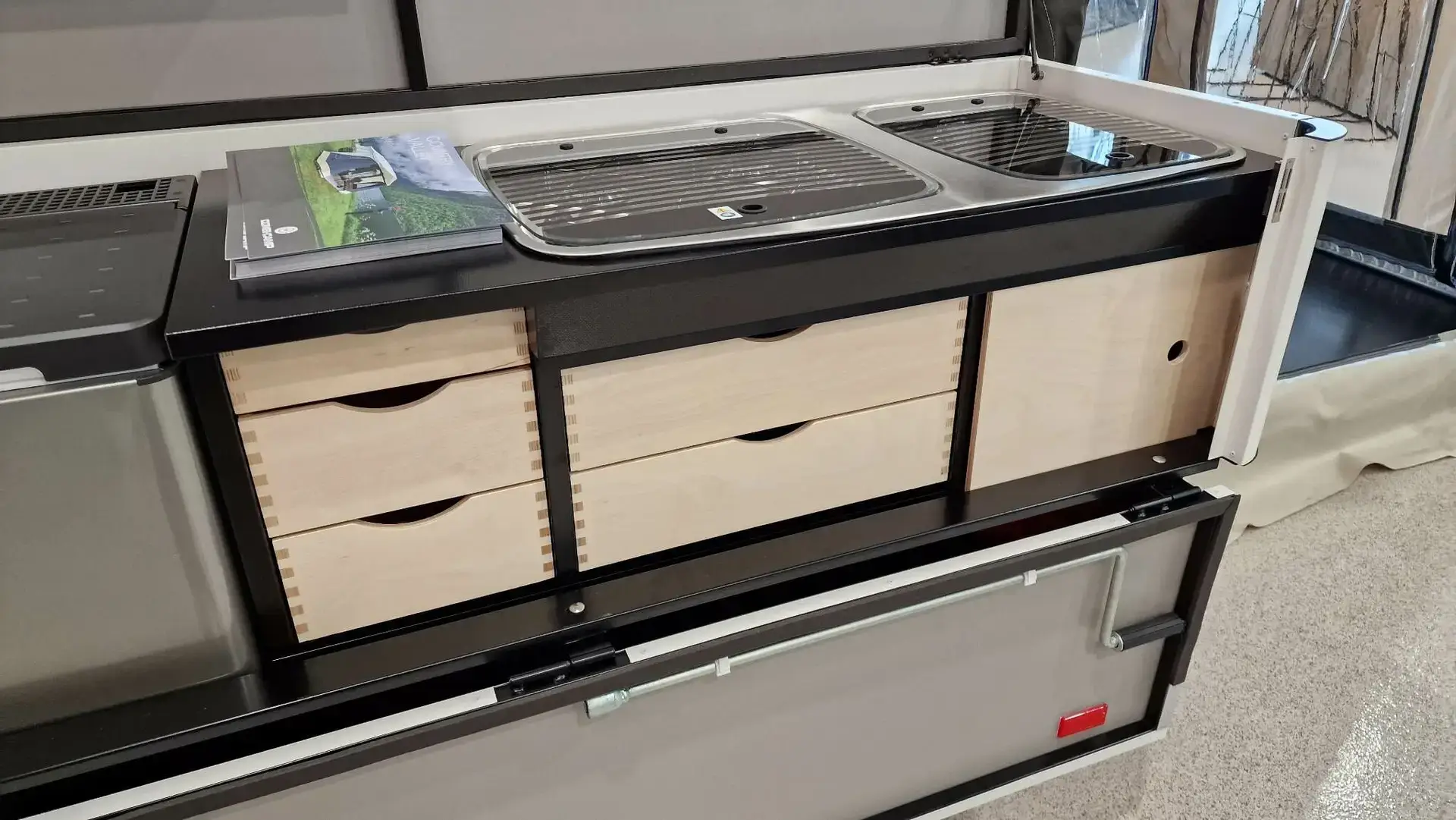- Innbyggður vaskur með vatnsdælu/krana sem knúinn er með 12V rafhlöðu